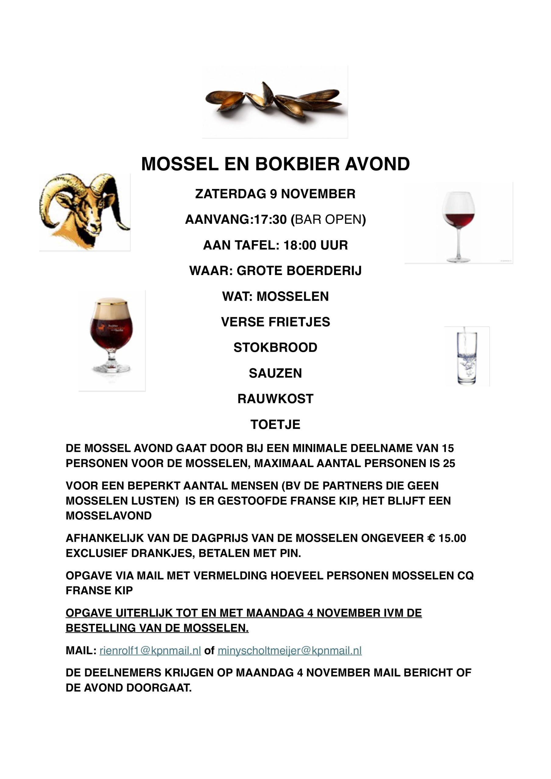 Zaterdagavond 9 november organiseren wij weer een Mossel- en Bokbier avond.
